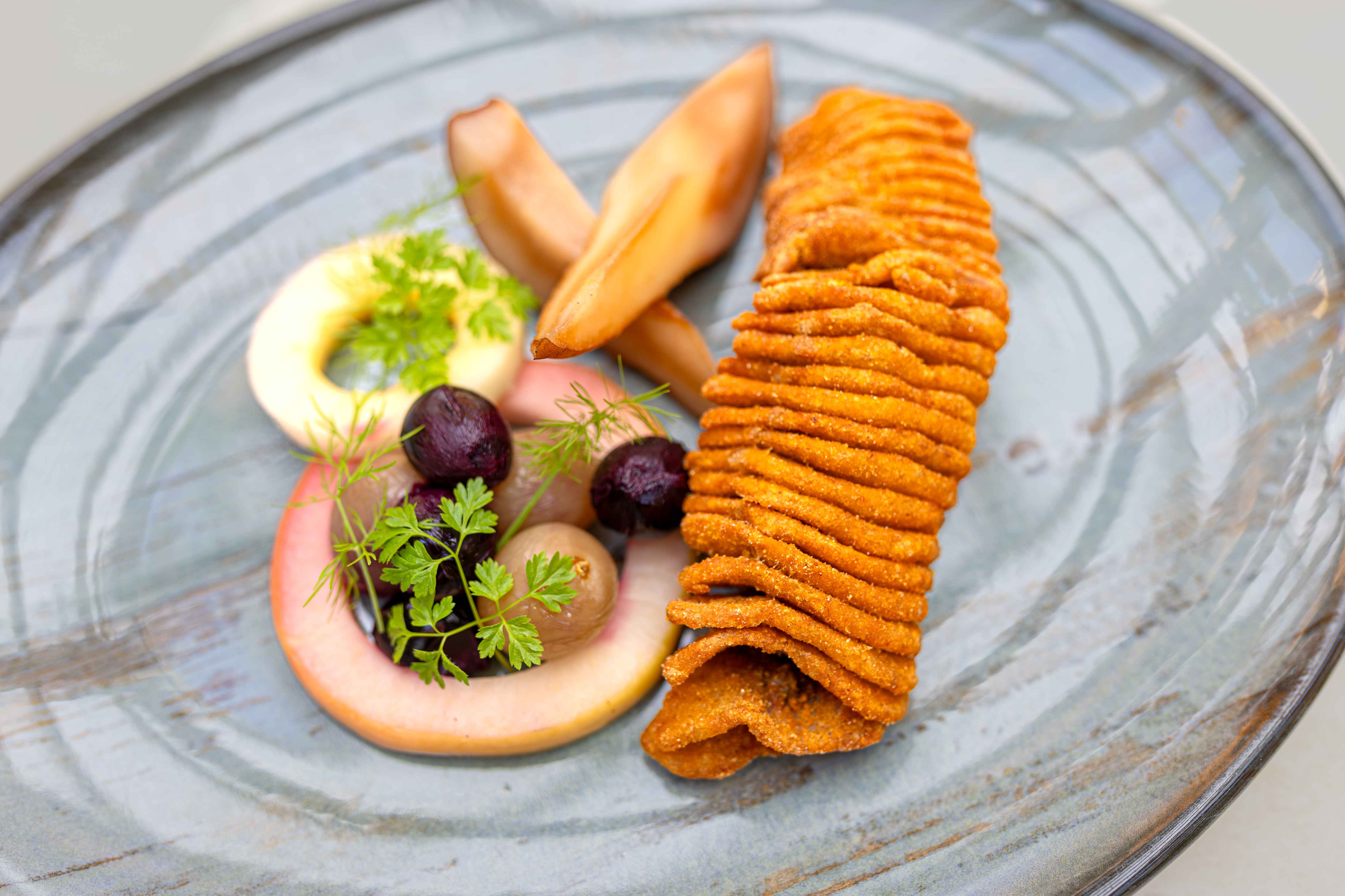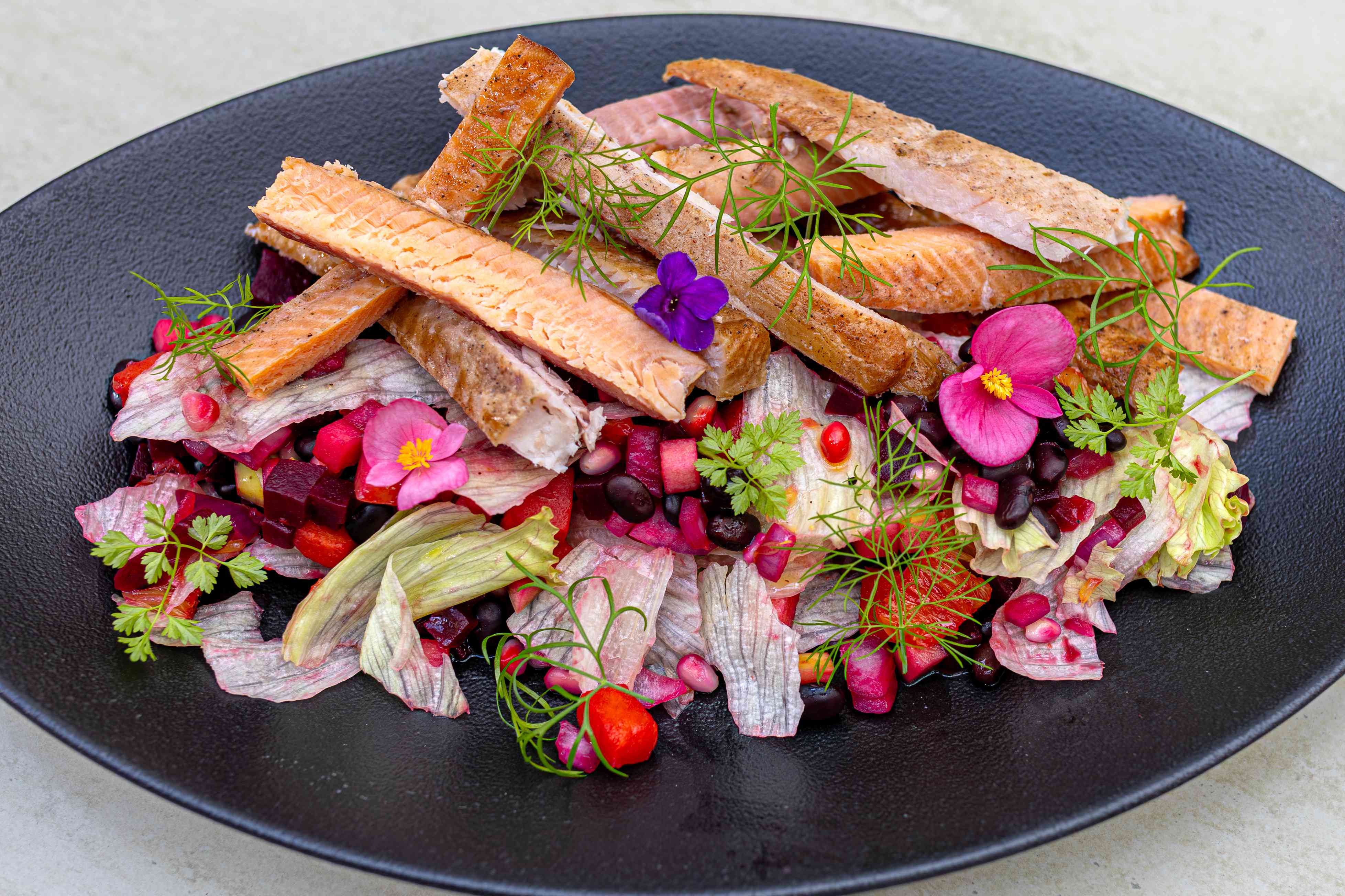/Smoked trout fillet, warm autumn salad, citrus dressing/