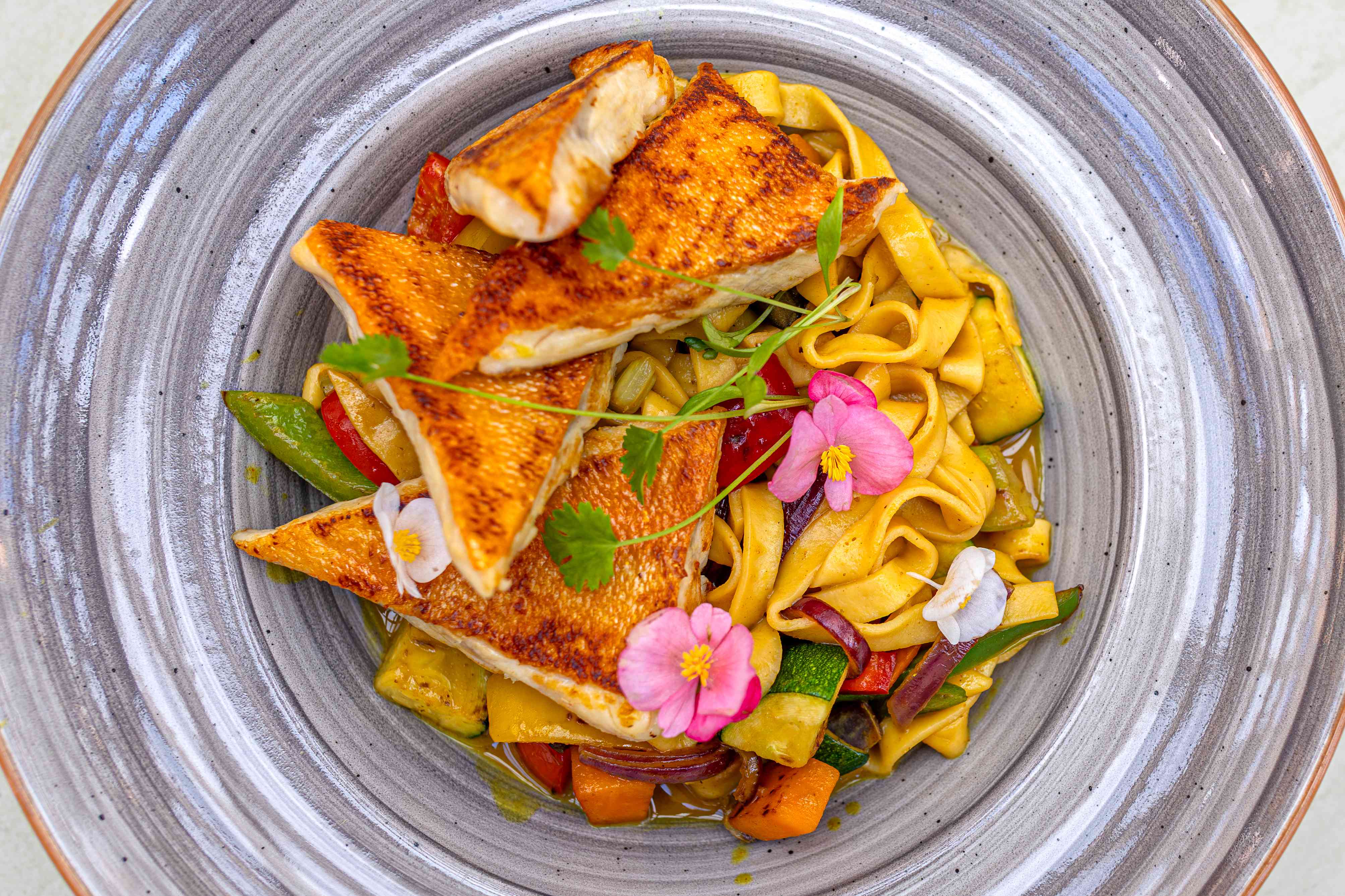 Arany pisztrángfilé, házi tagliatelle, szójás-tejszínes zöldséges ragu