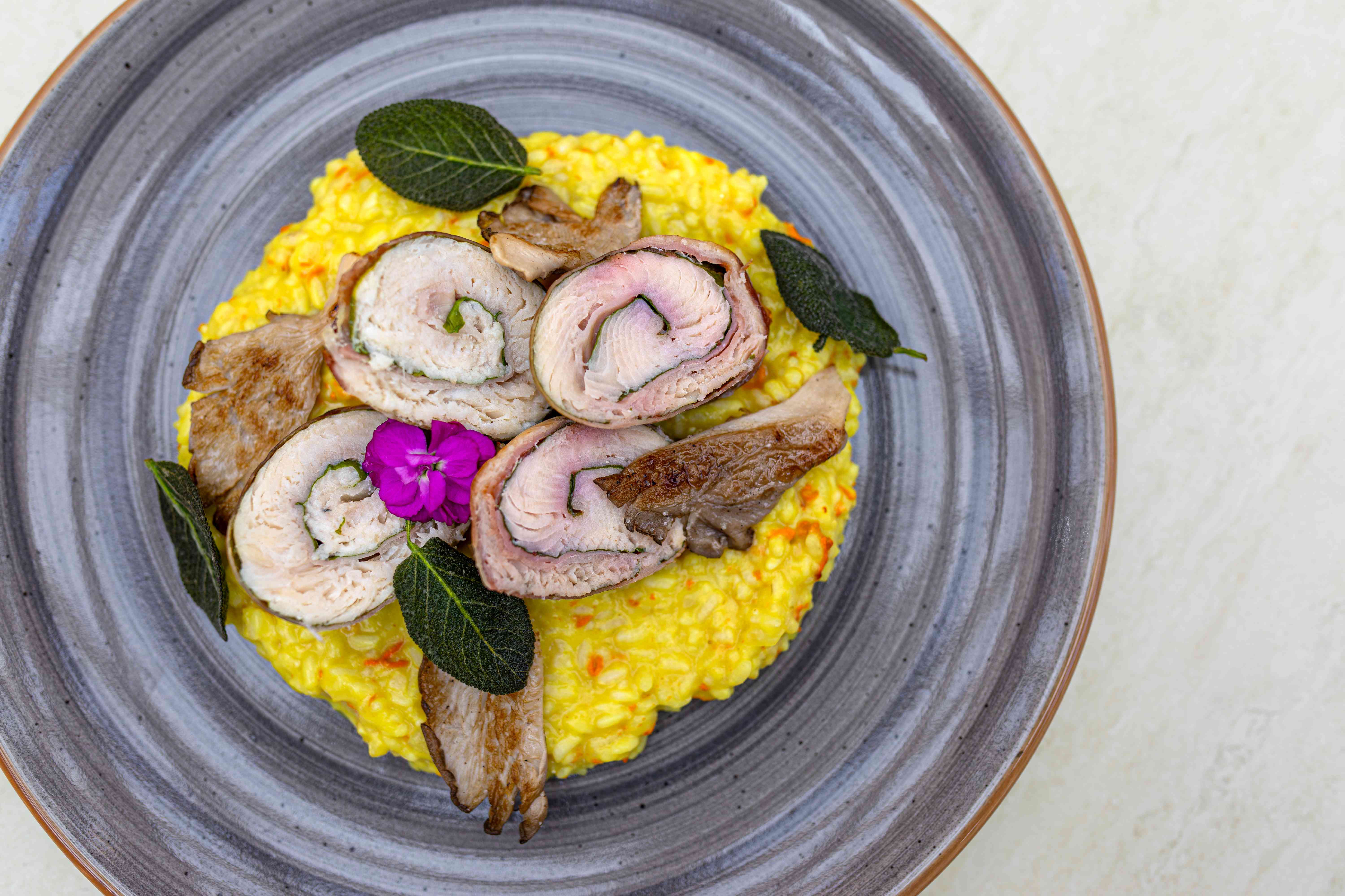 Pisztráng tekercs, kurkumás rizottó, laska gomba, ropogós zsálya