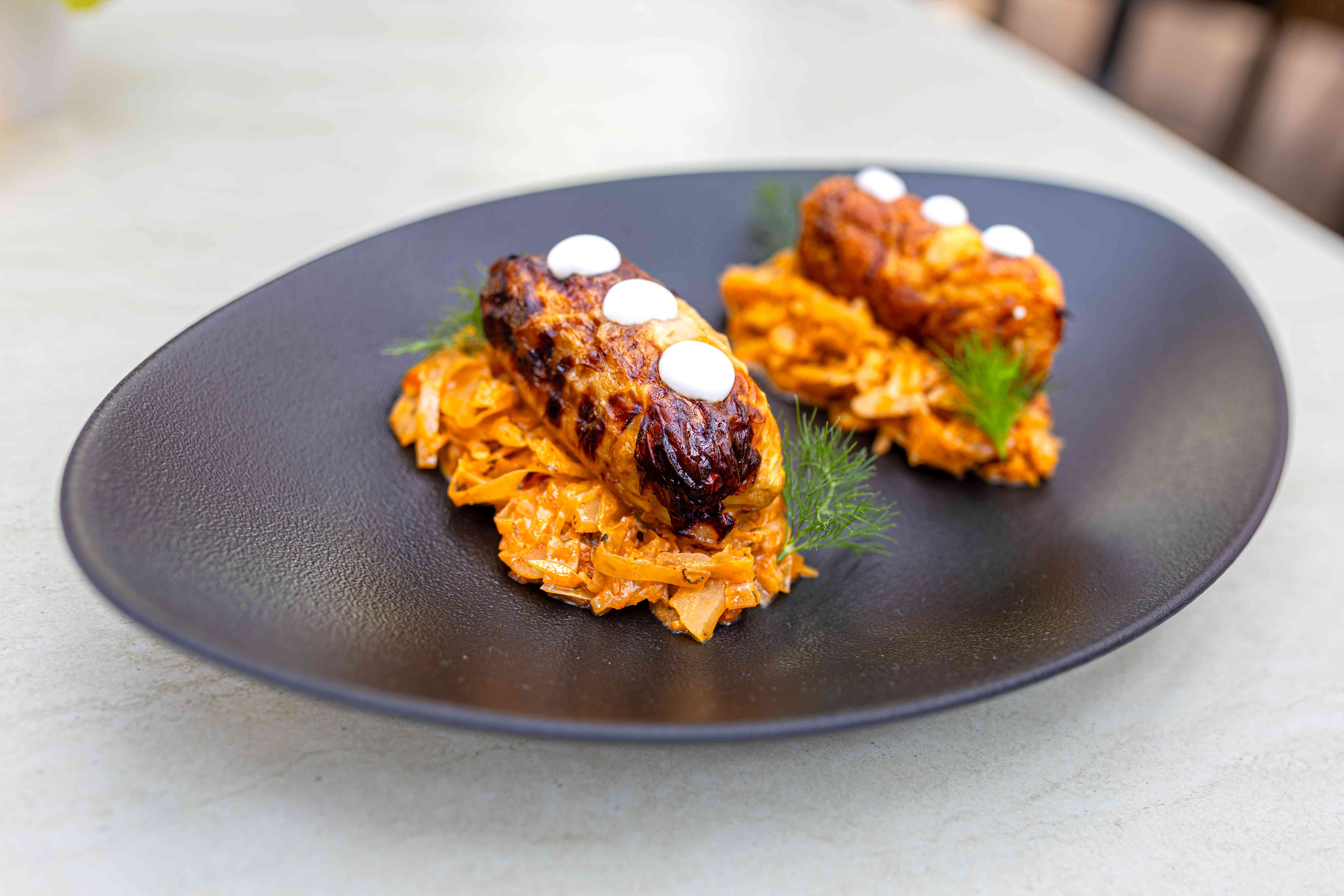 /Smoked trout fillet, salad, prunes dressing//Fish-stuffed cabbage rolls/