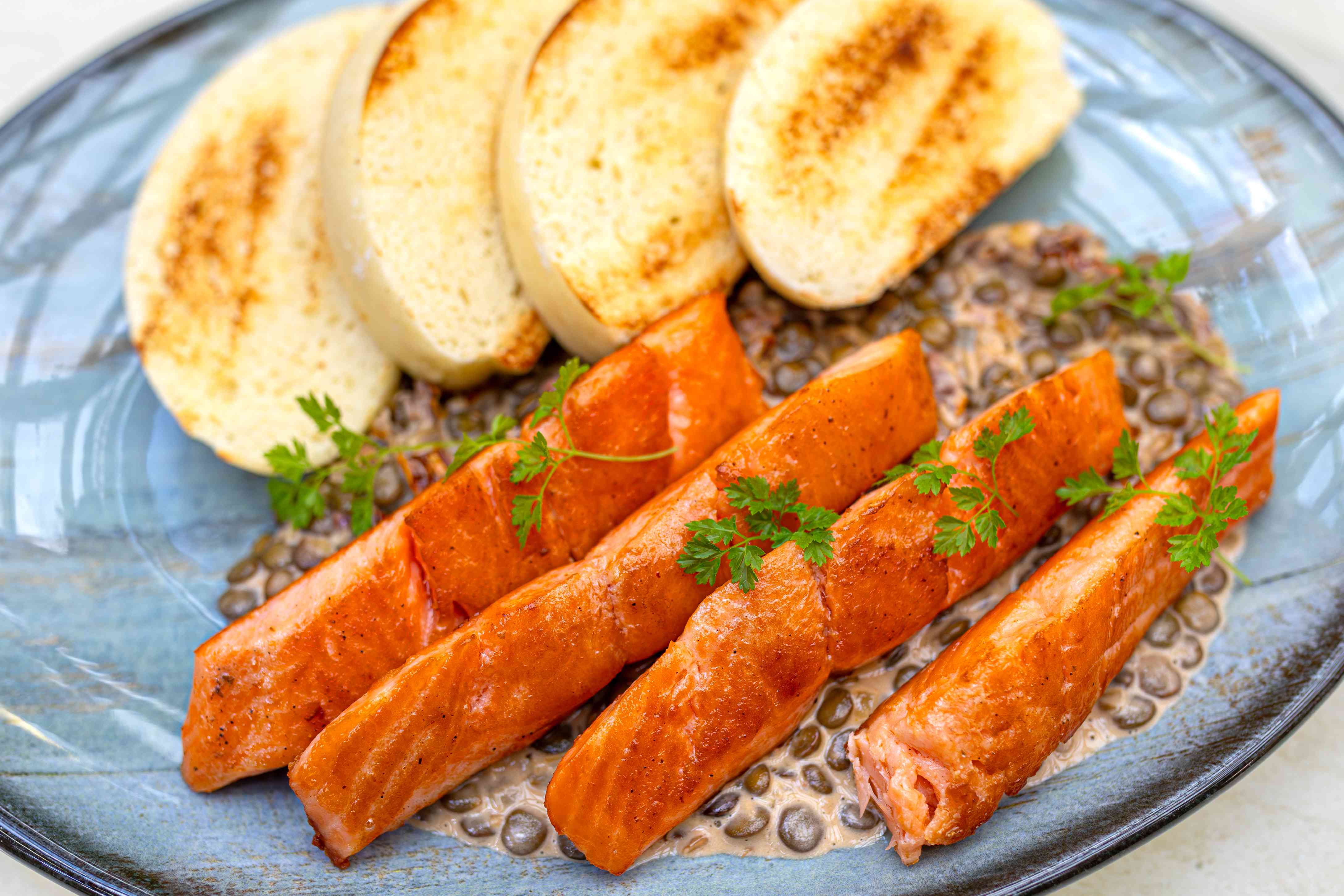 Hidegen füstölt lazacpisztráng filé, lencse ragu, knédli