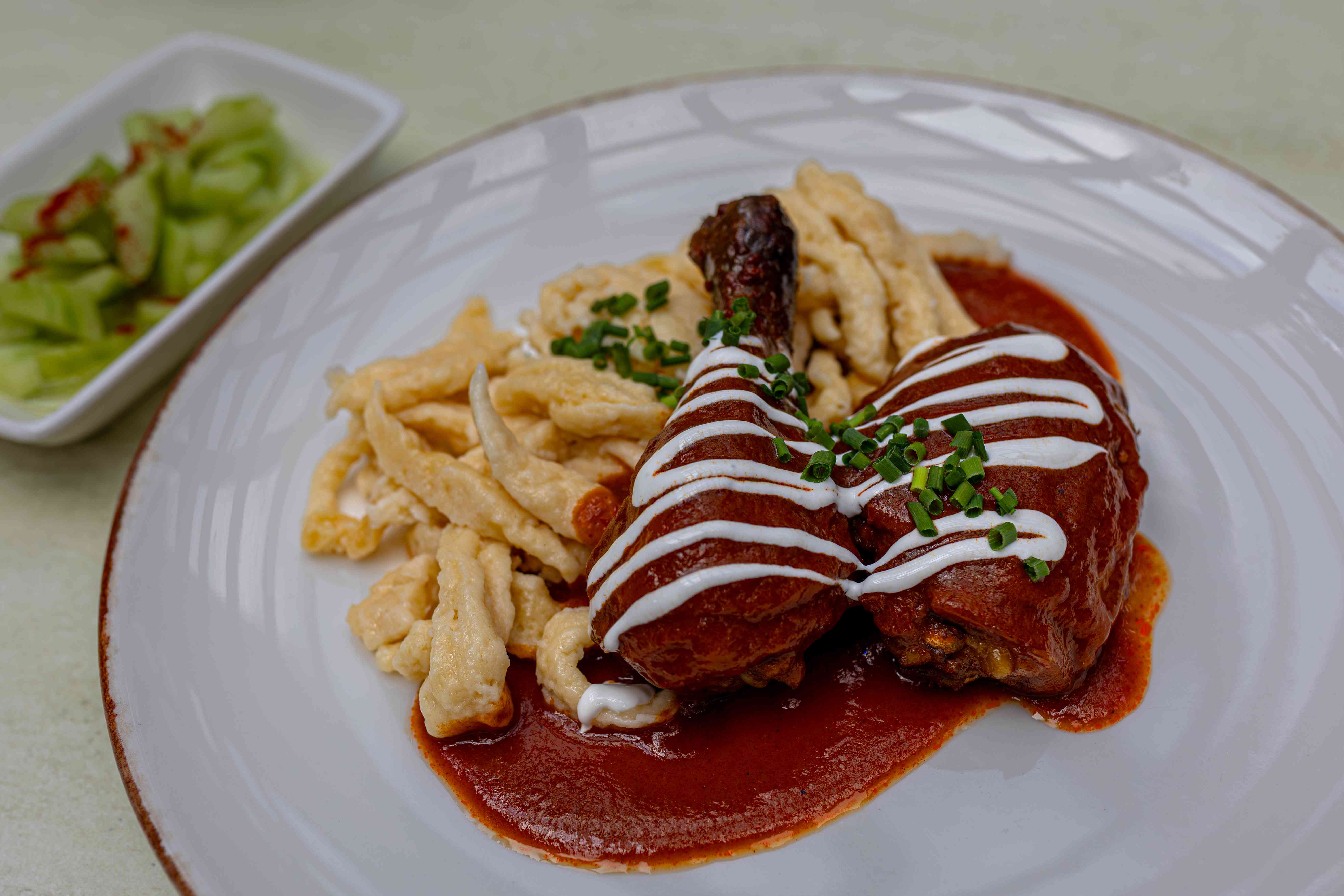 /Free-range chicken paprikash, homemade dumplings, pickled cucumber salad/